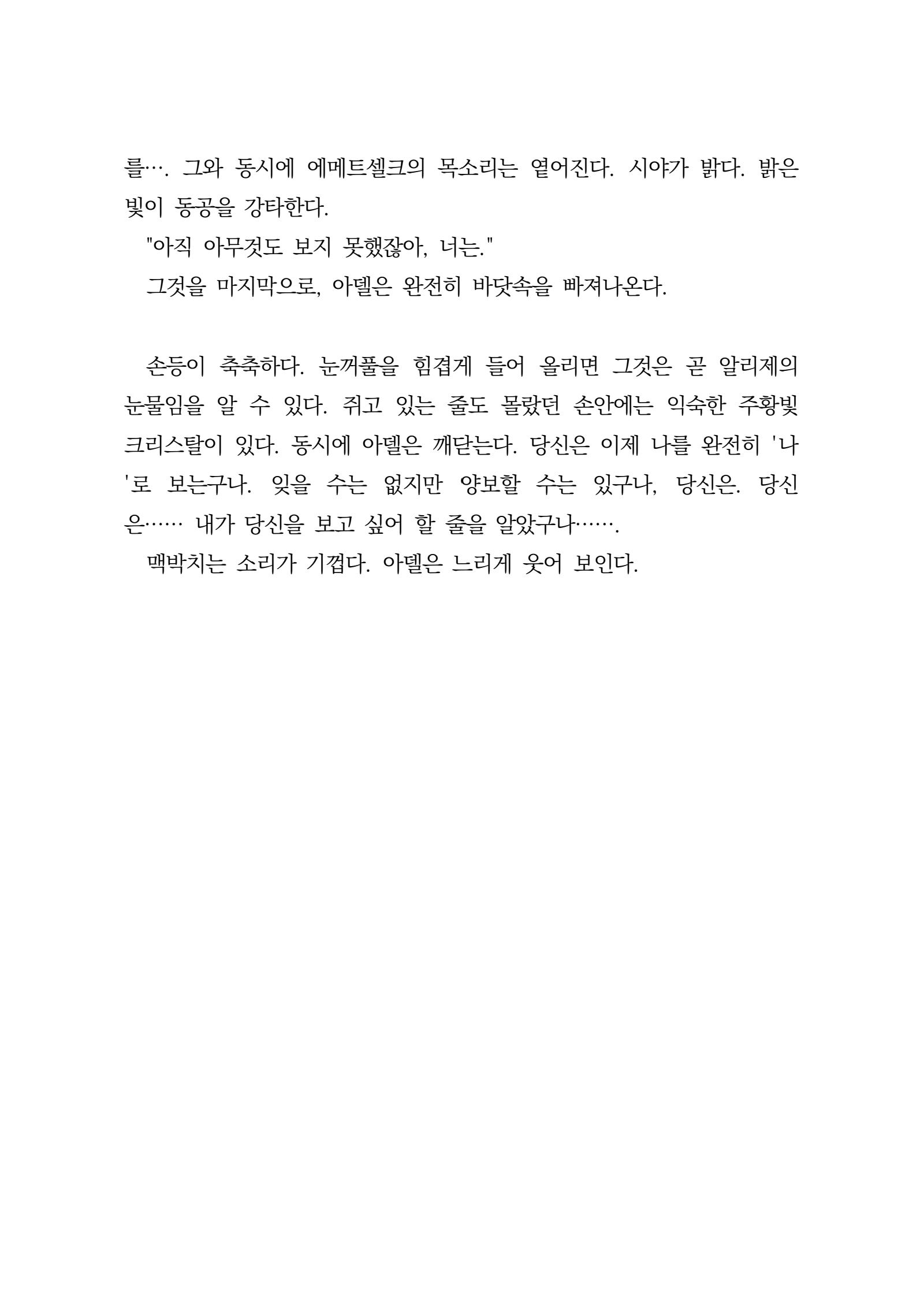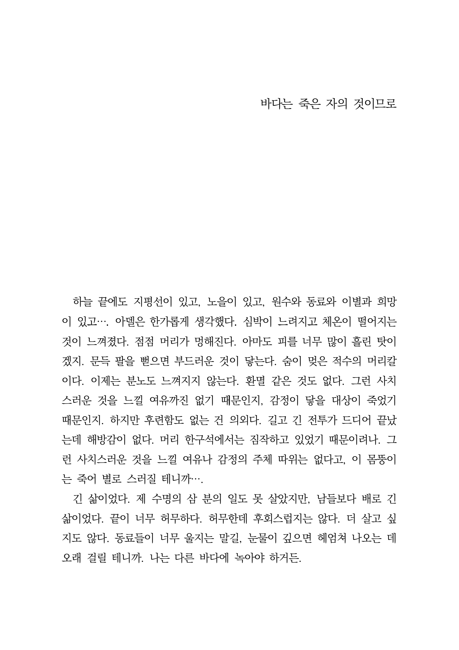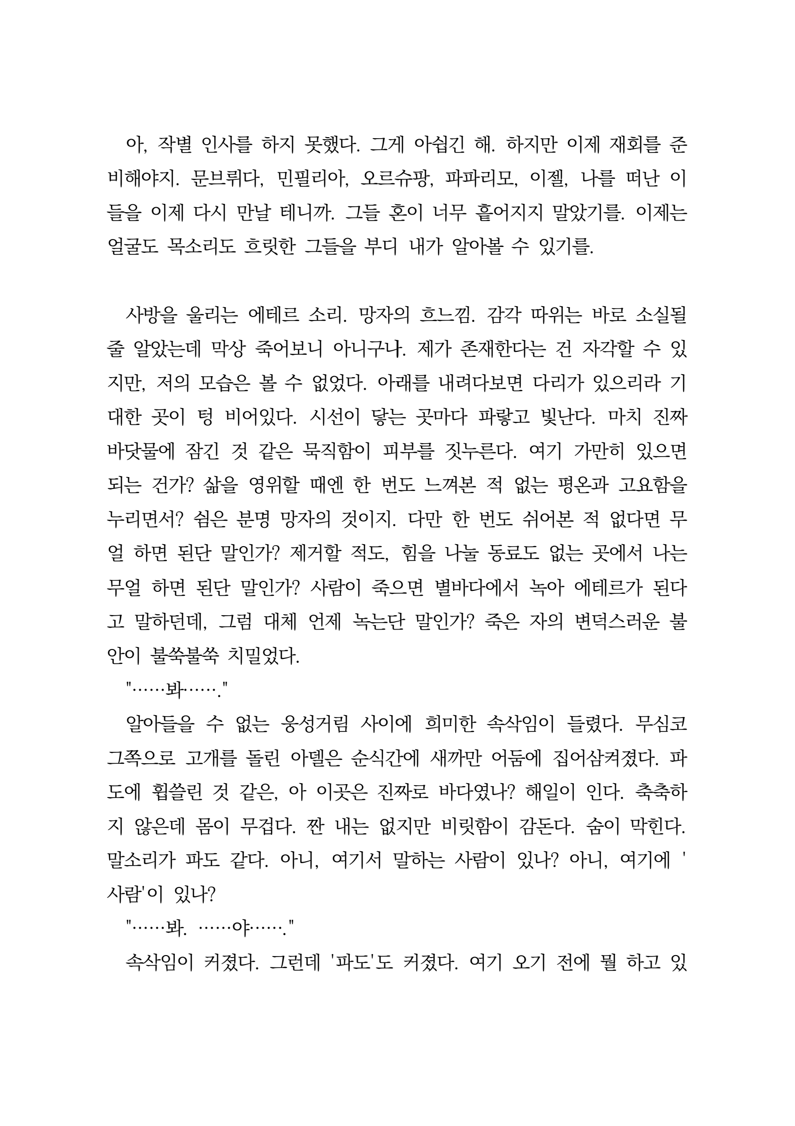 여름이 올 때마다 너를 사랑하고 싶어 파랑이 가득한 세상은 아무래도 낭만적이겠지 우리는 그렇게 영원의 발음을 외웠다 영원한 곳에서 영원을 빌며 편지를 쓰도록 할게 여름과 여름, 낭만은 그저 낭만일 뿐이고